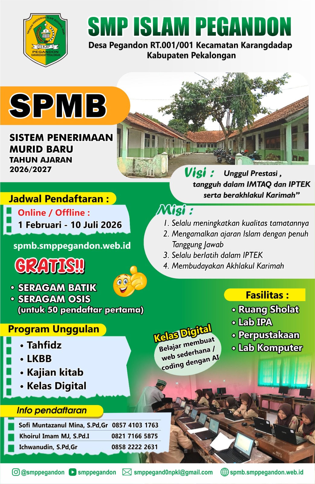 SMP Islam Pegandon membuka Sistem Penerimaan Murid Baru (SPMB) untuk Tahun Pelajaran 2026/2027. Kami mengundang para orang tua untuk mendaftarkan putra/putri tercinta bergabung dalam komunitas pembelajaran Islami yang berkarakter dan berprestasi.